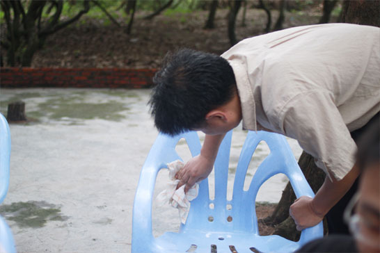 這位工程師不停地為大伙擦拭座位,顯示了恒晨人的內(nèi)秀